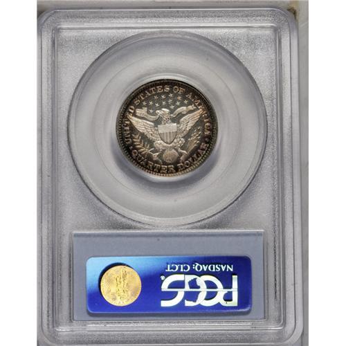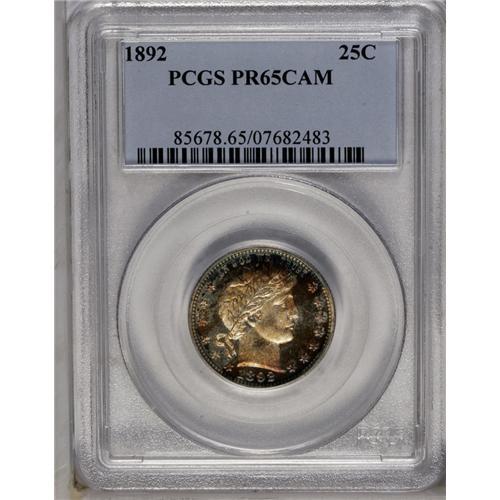 <B>1892<25C> PR65 Cameo PCGS.</B></I> Type Two Reverse. This razor-sharp Gem is adorned in fire-red, orange, and navy-blue hues. The major devices exhibit obvious frost. A beautiful proof Barber quarter from the inaugural year of the type.