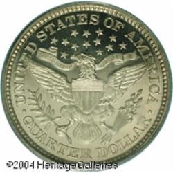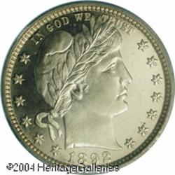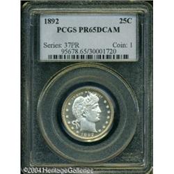 1892 25C PR65 Deep Cameo PCGS. Type Two Reverse. T <B>1892 25C PR65 Deep Cameo PCGS.</B></I> Type Two Reverse. This breathtaking Gem is earmarked for inclusion in a first-year type set. The cameo contrast is easily the most impressive feature, with richly frosted devices set atop deep mirrors in the fields. Just a hint of natural patina overlays both sides and appears to deepen, if ever so slightly, toward the denticles. A diagonal blemish is noted on Liberty's face from her eyebrow to her earlobe, this being the grade-limiting factor. <BR><BR><B>Important notice:</B> Heritage usually auctions material at the rate of 200-250 lots per hour. On some occasions eBay Live bid software or the Internet may not be able to keep up with the pace of the auction. We recommend placing a realistic absentee bid now as insurance to avoid disappointment. Occasionally the auctioneer may eliminate or reject an eBay Live bid, and the auctioneer may also reopen a lot after the close of the eBay live bidding (usually because we missed an audience bid), and may reject your bid even if it shows you as the winning bidder. By bidding via eBay Live, you agree that Heritage may award the lot to another bidder at its sole discretion under the circumstances described above or any other reasonable circumstances. Since eBay bids are not shown to us until we open the lot on the floor, we treat those bids just like floor bids. In most cases the floor responds before the eBay bid is presented to us, due to Internet lag time, so for consistency we have made it a policy that floor bids are always considered first over tie eBay live bids. Also please note that all Heritage lots purchased through eBay Live carry a 20% Buyer's Premium. Please make sure you read the Terms and Conditions before you bid. This lot is being auctioned in conjunction with a live floor auction by Heritage Galleries & Auctioneers. All final auction and invoice information will be supplied by Heritage Galleries & Auctioneers, and all other information should be considered preliminary. Lot:5919