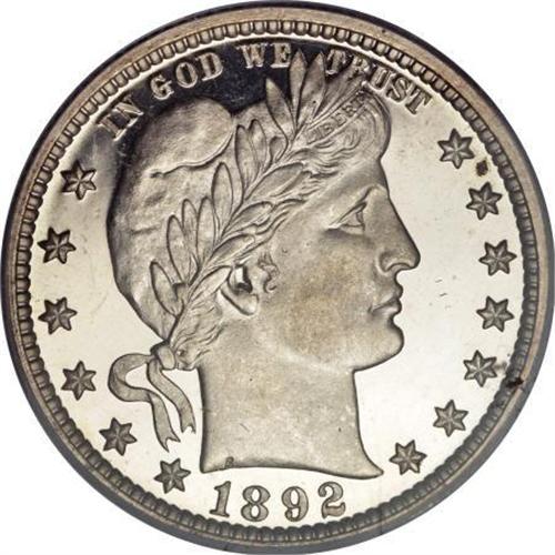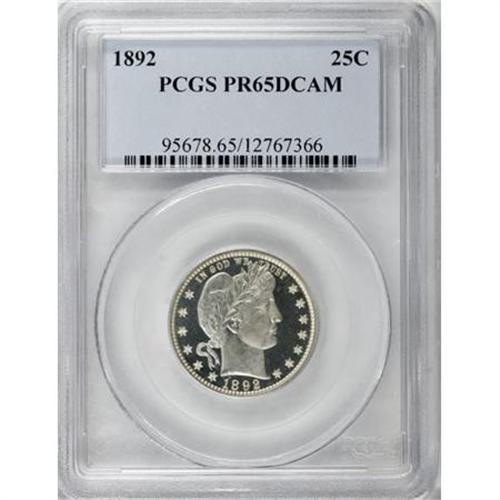 <B>1892 25C PR65 Deep Cameo PCGS.</B></I> Type Two Reverse. Profoundly deep mirrors and glacial frost are the highlights of this marvelous first-year type coin. Both sides are essentially untoned, save for a minor blush of golden coloration. Despite the generous mintage of 1,245 pieces, Gem Deep Cameos are surprisingly elusive: PCGS has certified eight pieces in this grade, with 11 finer (3/08).<BR><BR><b>Shipping:</b> Coins & Currency (<a target="_blank" href="http://www.heritageauctions.com/common/shipping.php">view shipping information</a>)