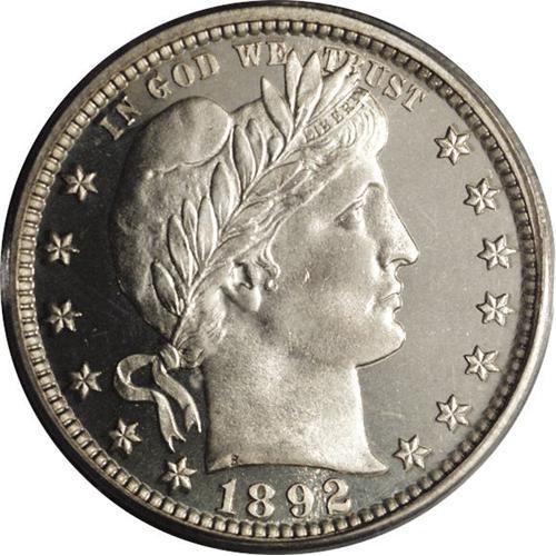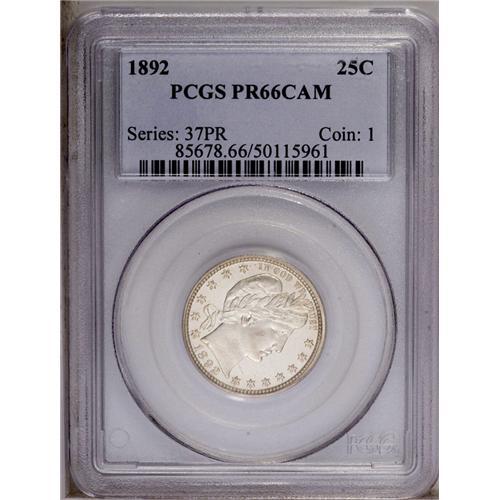 <B>1892<25C> PR66 Cameo PCGS.</B></I> Type Two Reverse. PCGS and NGC have certified about 520 1892 proof quarters, out of an original mintage of 1,245 pieces. About 100 of these certified proofs have been given the Cameo designation, the vast majority of which grade PR65 and below. This Premium Gem proof exhibits excellent contrast, particularly on the obverse, when the coin is tilted beneath a light source. The obverse is essentially untoned, while the reverse shows a thin layer of milky-tan color. The frosty design elements are sharply impressed throughout. A few minor ticks are visible under magnification on Liberty's cheek and temple. Population: 5 in 66 Cameo, 3 finer (4/06).