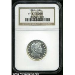 <table><tr><td><TABLE cellSpacing=0 cellPadding=0 width="100%" bgColor=#000000 border=0><TBODY> <TR><TD width="100%"><TABLE cellSpacing=1 cellPadding=3 width="100%" border=0><TBODY><TR><TD width="100%" bgColor=#79735c><FONT face=arial color=#ffffff size=3><B>Description</B> </FONT></TD></TR><TR><TD width="100%" bgColor=#ffffff><FONT face=arial size=2><B>1892 25C PR67 Cameo NGC.</B></I> Type Two Reverse. Faint apricot patina contributes to this otherwise untoned specimen. An exquisitely struck Superb Gem with lovingly preserved surfaces and obvious cameo contrast. The production of proof Barber coinage is highest for its initial year, 1892. One would suspect that the mintage soared from the 600 pieces of the prior year because of the new designs, but another explanation is the Columbian Exposition in Chicago, where such sets were offered for sale. Population: 12 in 67 Cameo, 2 finer (7/03). </FONT></TD></TR></TBODY></TABLE></TD></TR></TBODY></TABLE><BR><A name=PricesRealized></A><TABLE cellSpacing=0 cellPadding=0 width="100%" bgColor=#000000 border=0><TBODY><TR><TD width="100%"><TABLE cellSpacing=1 cellPadding=3 width="100%" border=0><TBODY><TR><TD width="100%" bgColor=#79735c><A name=PR><FONT face=arial color=#ffffff size=3><B>Previous Prices from Heritage Auctions</B> </FONT></A></TD></TR><TR><TD bgColor=#f6f6ed><TABLE cellSpacing=0 cellPadding=0 width="100%" border=1><TBODY><TR><TD align=middle width="33%"><B>Date</B></TD><TD align=middle width="33%"><B>Service</B></TD><TD align=middle width="33%"><B>Price</B></TD></TR><TR bgColor=whitesmoke><TD width="33%"><B>01/11/2003</B></TD><TD width="33%">NGC</TD><TD width="33%">$4,255.00</TD></TR></TBODY></TABLE></TD></TR><TR><TD bgColor=#ffffff><FONT face=arial size=1 ?>PLEASE NOTE: All prices realized reflect the final hammer price PLUS the buyer's premium in auctions that charge a buyer's premium. Each item has a notation at the top of the listing indicating whether that lot included a buyer's premium. Example: A item that sells with a final hammer price of $100 and a 20% buyer's premium will display with a price realized of $120. All information listed is intended to be as accurate as possible, but errors are possible. Please use this guide carefully and inform us of any inaccuracies. </FONT></TD></TR></TBODY></TABLE></TD></TR></TBODY></TABLE><BR><TABLE cellSpacing=0 cellPadding=0 width="100%" bgColor=#000000 border=0><TBODY><TR><TD width="100%"><TABLE cellSpacing=1 cellPadding=3 width="100%" border=0><TBODY><TR><TD width="100%" bgColor=#79735c colSpan=6><FONT face=arial color=#ffffff size=3><B>Price Guide*</B> </FONT></TD></TR><TR bgColor=#f6f6ed><TD align=middle><B>Grade</B> </TD><TD align=middle><B>Coin World<BR>(Trends)</B> </TD><TD align=middle><B>Numismedia<BR>Retail</B> </TD><TD align=middle><B>Numismedia<BR>Wholesale</B> </TD><TD align=middle><B>Coin<BR>Universe</B> </TD><TD align=middle><B>Heritage<BR>Value Index</B> </TD></TR><TR bgColor=#ffffff><TD align=middle>66</TD><TD align=right>---</TD><TD align=right>---</TD><TD align=right>---</TD><TD align=right>---</TD><TD align=right>---</TD></TR><TR style="FONT-WEIGHT: bold" bgColor=#cccfdd><TD align=middle>67</TD><TD align=right>---</TD><TD align=right>---</TD><TD align=right>---</TD><TD align=right>---</TD><TD align=right>---</TD></TR><TR bgColor=#ffffff><TD align=middle>68</TD><TD align=right>---</TD><TD align=right>---</TD><TD align=right>---</TD><TD align=right>---</TD><TD align=right>---</TD></TR><TR bgColor=#ffffff><TD colSpan=6><FONT size=1>*All information listed is intended to be as accurate as possible, but errors are possible. No item may be returned or refused based on this information which is provided as a service to our customers. You should contact each pricing source directly to determine the accuracy of this information. </FONT></TD></TR></TBODY></TABLE></TD></TR></TBODY></TABLE><BR><TABLE cellSpacing=0 cellPadding=0 width="100%" bgColor=#000000 border=0><TBODY><TR><TD width="100%"><TABLE cellSpacing=1 cellPadding=3 width="100%" border=0><TBODY><TR><TD width="100%" bgColor=#79735c><FONT face=arial color=#ffffff size=3><B>Population Guide</B> </FONT></TD></TR><TR bgColor=#ffffff><TD align=middle><!-- Begin Output of Population Grid--><TABLE cellSpacing=0 cellPadding=0 width="100%" border=0><TBODY><TR><TD vAlign=center><TABLE cellSpacing=0 width="100%" border=1 cellsadding="3"><TBODY><TR><TD vAlign=center><TABLE cellSpacing=0 cellPadding=3 width="100%" border=1><TBODY><TR><TD vAlign=center align=middle bgColor=#f0f1e8 colSpan=2 <CENTER><FONT face=Arial size=2><B>PCGS Pop </B></FONT><CENTER></CENTER></TD><TD vAlign=center align=middle bgColor=#f0f1e8 colSpan=2><CENTER><FONT face=Arial size=2><B>NGC Pop</B></CENTER></FONT></TD></TR><TR><TD vAlign=center><FONT face=Arial size=2>(67)</FONT> </TD><TD vAlign=center align=right><FONT face=Arial size=2>2</FONT> </TD><TD vAlign=center><FONT face=Arial size=2>(67)</FONT> </TD><TD vAlign=center align=right><FONT face=Arial size=2>12</FONT> </TD></TR><TR><TD vAlign=center><FONT face=Arial size=2>(>67)</FONT> </TD><TD vAlign=center align=right><FONT face=Arial size=2>0</FONT> </TD><TD vAlign=center><FONT face=Arial size=2>(>67)</FONT> </TD><TD vAlign=center align=right><FONT face=Arial size=2>2</FONT> </TD></TR></TBODY></TABLE></TD></TR></TBODY></TABLE></TD></TR></TBODY></TABLE><!-- End Output of Population Grid--></TD></TR></TBODY></TABLE></TD></TR></TBODY></TABLE><BR><TABLE cellSpacing=0 cellPadding=0 width="100%" bgColor=#000000 border=0><TBODY><TR> Important notice: Heritage usually auctions material at the rate of 200-250 lots per hour. On some occasions eBay Live bid software or the Internet may not be able to keep up with the pace of the auction. We recommend placing a realistic absentee bid now as insurance to avoid disappointment. Occasionally the auctioneer may eliminate or reject an eBay Live bid, and the auctioneer may also reopen a lot after the close of the eBay live bidding (usually because we missed an audience bid)