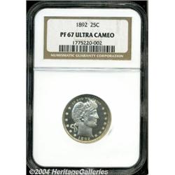 <B>1892<25C> PR67 Ultra Cameo NGC.</B></I> The fact that we have two Superb Gem Cameo quarters from this year reinforces the popularity of this initial year of issue for the Charles Barber design. Barber's design may have lacked the artistic accomplishment of the previous Seated Liberty design that was based on Christian Gobrecht's dollars from the 1830s, and it certainly was not as inspired as Hermon MacNeil's Standing Liberty design that followed in 1916. However, as Chief Engraver Charles Barber mastered two elements of his position in the Mint. One, he is unequalled in Neoclassical design elements. One may argue the value of this, but in late 19th century America, Neoclassicism was seen throughout the land on public buildings, in works of art, and all manner of artistically accomplished endeavors. Second, and perhaps most importantly for numismatists, Barber understood the needs of high speed, large production coinage. His designs were always in low relief, and thus, well suited to the Mint's needs to only stamp a planchet once to achieve a full (or at least sharp) strike. This second element also works to the advantage of modern collectors as Barber's coins are more often found in high grades because they were struck in low relief, and were more easily preserved by successive generations of collectors.<BR> This particular coin is an exceptionally well preserved coin that has deep, watery reflectivity in the fields and chalk-white devices that provide a stark cameo contrast on each side. Impeccably preserved, as one would expect from the PR67 grade designation. Population: 4 in 67, 6 finer (7/04). <BR><BR><B>Important notice:</B> Heritage usually auctions material at the rate of 200-250 lots per hour. On some occasions eBay Live bid software or the Internet may not be able to keep up with the pace of the auction. We recommend placing a realistic absentee bid now as insurance to avoid disappointment. Occasionally the auctioneer may eliminate or reject an eBay Live bid, and the auctioneer may also reopen a lot after the close of the eBay live bidding (usually because we missed an audience bid), and may reject your bid even if it shows you as the winning bidder. By bidding via eBay Live, you agree that Heritage may award the lot to another bidder at its sole discretion under the circumstances described above or any other reasonable circumstances. Since eBay bids are not shown to us until we open the lot on the floor, we treat those bids just like floor bids. In most cases the floor responds before the eBay bid is presented to us, due to Internet lag time, so for consistency we have made it a policy that floor bids are always considered first over tie eBay live bids. Also please note that all Heritage lots purchased through eBay Live carry a 20% Buyer's Premium. Please make sure you read the Terms and Conditions before you bid. </span></font></tr></table></td></tr></table>
