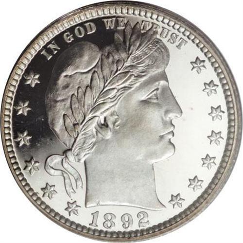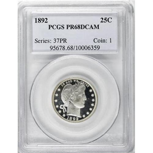 <B>1892 25C PR68 Deep Cameo PCGS.</B></I> Type Two Reverse. One of the first things one learns when studying U.S. numismatics is that first year of type dates were often saved in relatively large numbers because of the newness of the design type. That is certainly the case with 1892 Barber coinage. However, commonness as a date should not be confused with a lack of desirability or difficulty in the ultimate grade(s). Only one other PCGS PR68 Deep Cameo has been certified, and NGC has graded seven pieces as PR68 Ultra Cameo (11/07). <BR> This is an exceptional coin that displays stark white-on-black cameo contrast. The cameo effect is equally matched on both sides. The devices are heavily frosted, and the surfaces overall are essentially perfect, as indicated by the grade. Brilliant throughout. <BR><BR><b>Shipping:</b> Coins & Currency (<a target="_blank" href="http://www.heritageauctions.com/common/shipping.php">view shipping information</a>)