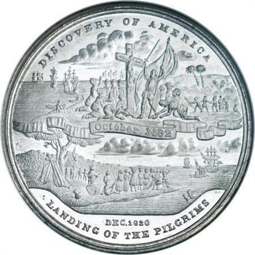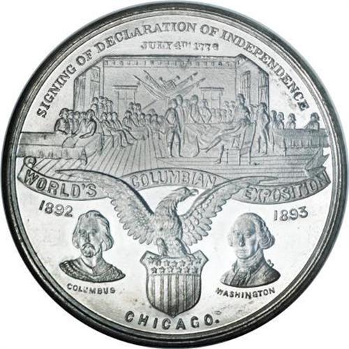 <B>1892-3 World's Columbian Exposition, Declaration of Independence, IL HK-157, MS63 NGC.</B></I> White metal. Struck by Boldenweck and Co. The obverse depicts the signing of the Declaration of Independence and the reverse commemorates the 400th anniversary of Columbus' landing. An attractive prooflike example. Listed as "Rare" in the so-called dollars reference.<BR><BR><b>Shipping:</b> Coins & Currency (<a target="_blank" href="http://www.heritageauctions.com/common/shipping.php">view shipping information</a>)