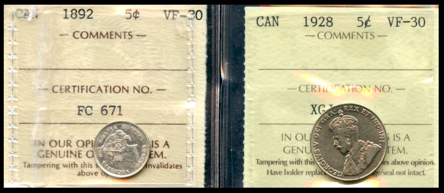 1892 5¢ & 1928 ICCS Choice Very Fine-30. Lot of 2 coins.