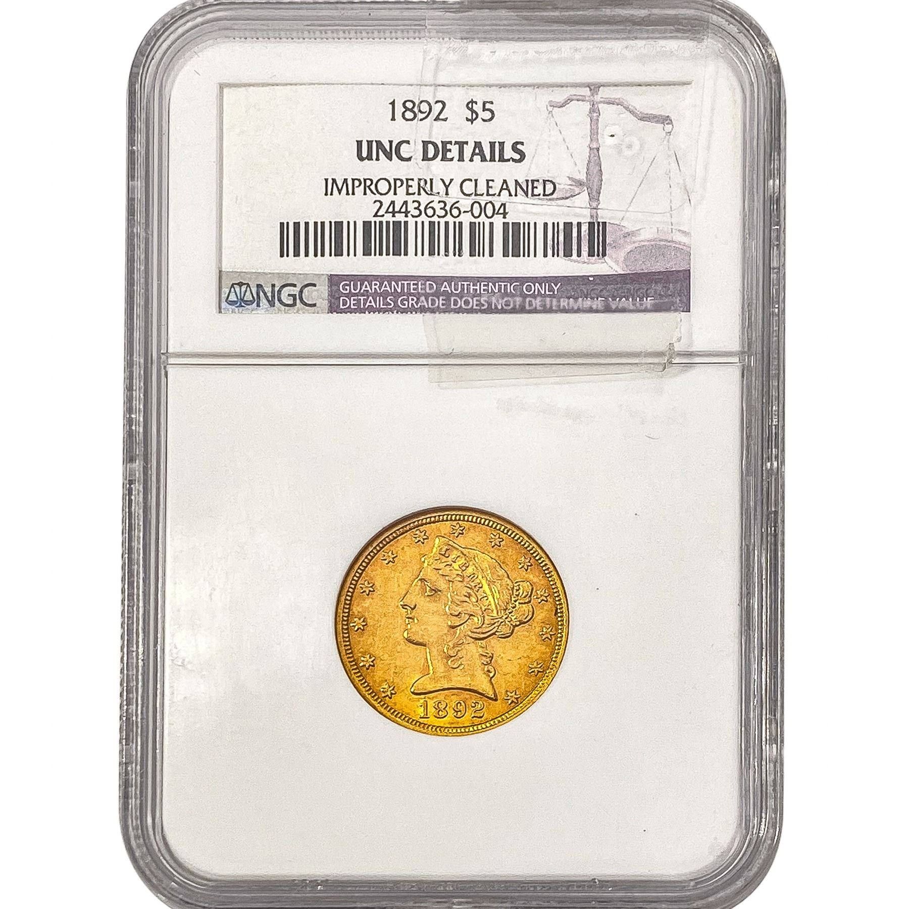1892 $5 Gold Half Eagle NGC UNCDetails