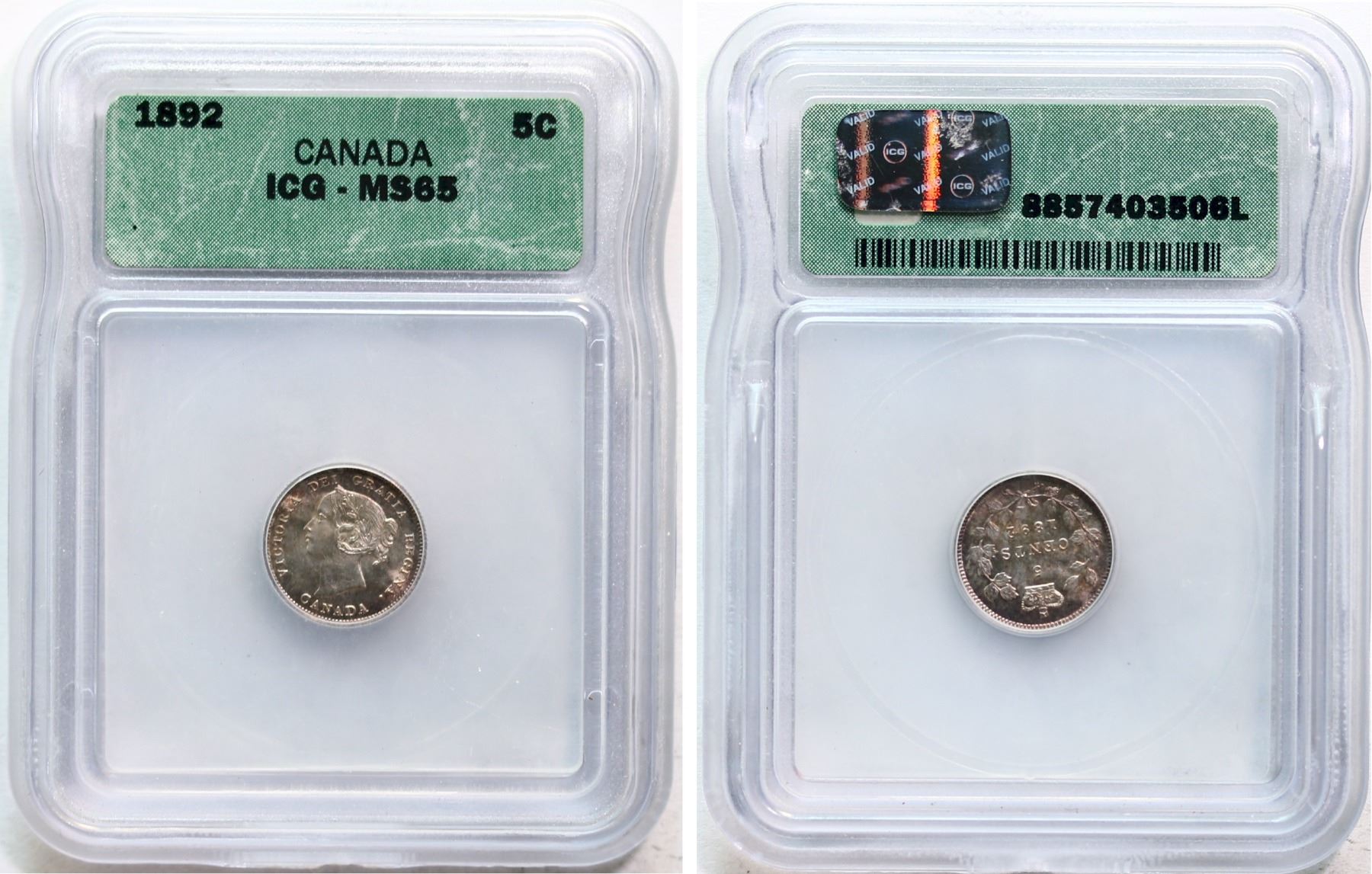 1892 5¢ ICG Gem Mint State-65 Delicate gold and russet tones over full underlying lustre. A vey nice and appealing example.