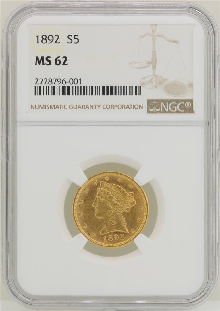 One 1892 $5 Liberty Head Half Eagle Gold Coin NGC MS62. NGC Certified.