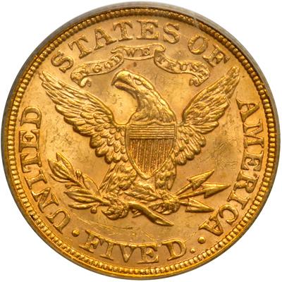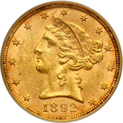1892 $5 Liberty. PCGS graded MS-60. Housed in an Old Green Holder. Some marks on the cheek (PCGS # 8379) .