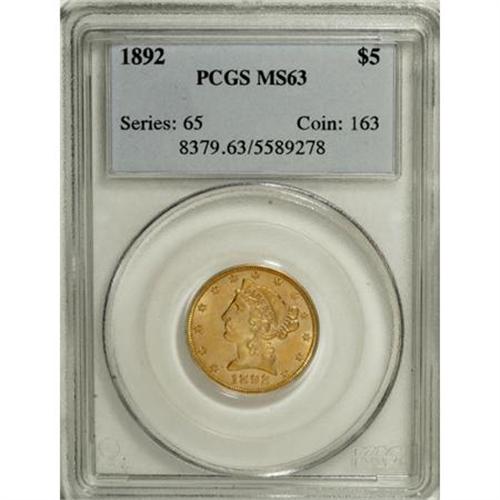 <B>1892 $5 MS63 PCGS.</B></I> Well struck and pleasingly lustrous, with lovely pink-rose and red-gold toning. The obverse is surprisingly smooth, and the reverse is also clean for the designated grade.<BR><BR><b>Shipping:</b> Coins & Currency (<a target="_blank" href="http://www.heritageauctions.com/common/shipping.php">view shipping information</a>)