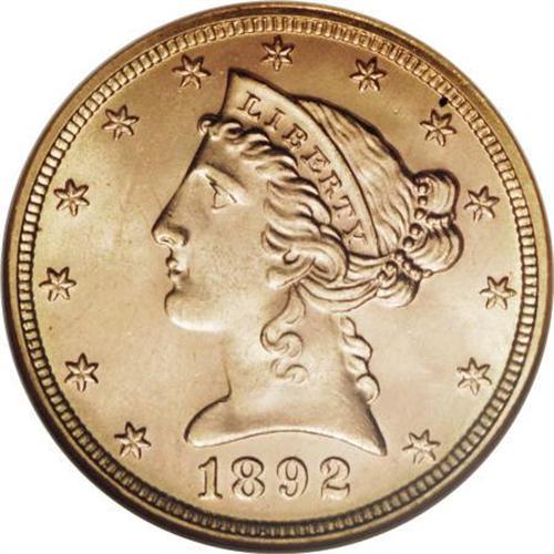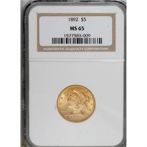 <B>1892 $5 MS65 NGC.</B></I> An amazing Gem with frosty pinkish-gold luster and exceptional eye appeal. This is a scarce date, despite a substantial mintage of more than 750,000 coins. NGC has certified equal quantities in MS65 and in all finer grades. Census: 37 in 65, 37 finer (10/07).<BR><BR><B>Coin Engraver:</B> Christian Gobrecht<BR><BR><b>Shipping:</b> Coins & Currency (<a target="_blank" href="http://www.heritageauctions.com/common/shipping.php">view shipping information</a>)