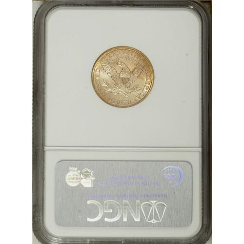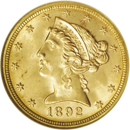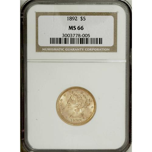 <B>1892 $5 MS66 NGC.</B></I> Just over three-quarters of a million half eagles were produced at the Philadelphia mint in 1892, but Premium Gems are very elusive. Only a dozen pieces have been graded finer by PCGS and NGC combined. This piece is razor sharp highly frosted surfaces. An abundant amount of rose-golden color lends eye appeal and originality to this superlative specimen. A small planchet flaw resides to the right of star 1.<BR><BR><b>Shipping:</b> Coin/Currency (<a target="_blank" href="http://www.heritageauctions.com/common/shipping.php">view shipping information</a>)