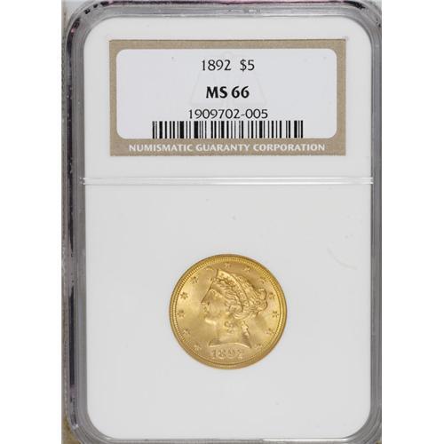 <B>1892 $5 MS66 NGC.</B></I> Though surprisingly elusive when all Mint State grades are taken into account, Garrett and Guth note that the 1892 half eagle is comparatively available in Gem or better grades, thanks to a small hoard of high-grade pieces identified in 1999. This uncommonly appealing example may have come from that group. The shimmering apricot-gold surfaces host well-defined devices that display only a handful of minuscule marks. A pretty piece that would make a strong candidate for a type or date set. Census: 22 in 66, 12 finer (3/07).<BR><BR><b>Shipping:</b> Coins & Currency (<a target="_blank" href="http://www.heritageauctions.com/common/shipping.php">view shipping information</a>)