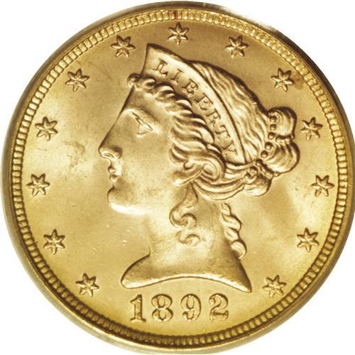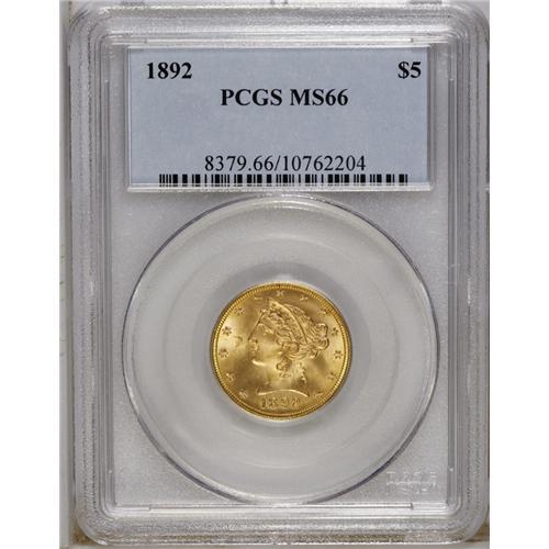 <B>1892 $5 MS66 PCGS.</B></I> Here is one of the so-called common date issues that is elusive in high grade, despite the discovery of a small hoard almost a decade ago. In MS66 and higher grades, this date has the third highest population, although there is no doubt that many of the MS66 coins reported in the population record are resubmissions of a smaller number of actual coins. This is a remarkable piece with frosty yellow luster and sharp design details. Population: 22 in 66, 2 finer (12/06).<BR><BR><b>Shipping:</b> Coins & Currency (<a target="_blank" href="http://www.heritageauctions.com/common/shipping.php">view shipping information</a>)