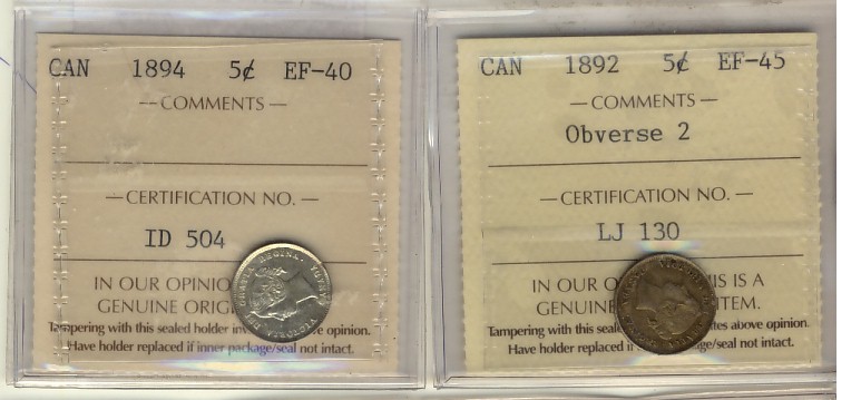 1892 5¢ Obv 2 & 1894 ICCS EF45. Lot of 2 coins.