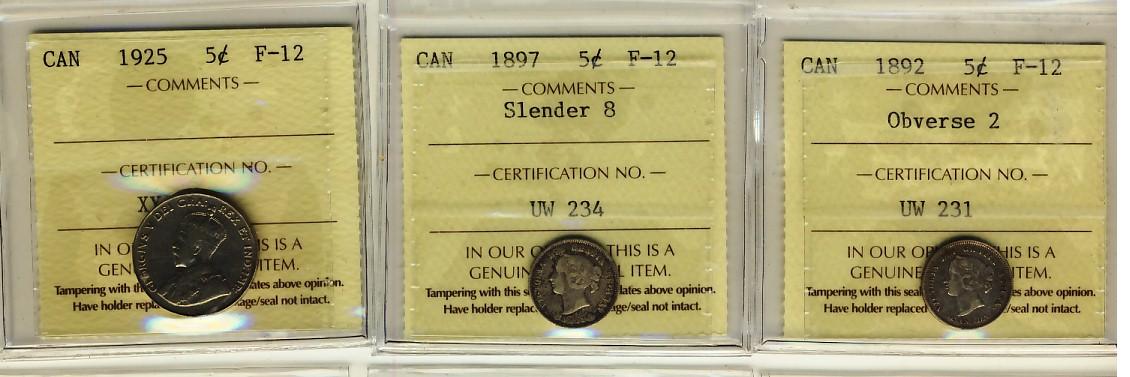 1892 5¢ Obv 2, 1897 Slender & 1925 F12. Lot of 3 ICCS coins.