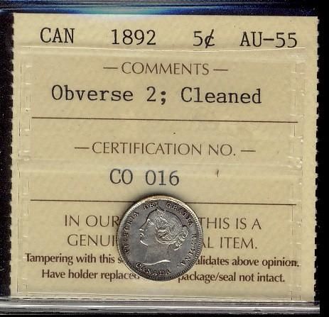 1892 5¢ Obv 2 ICCS AU55. Designated, Cleaned.