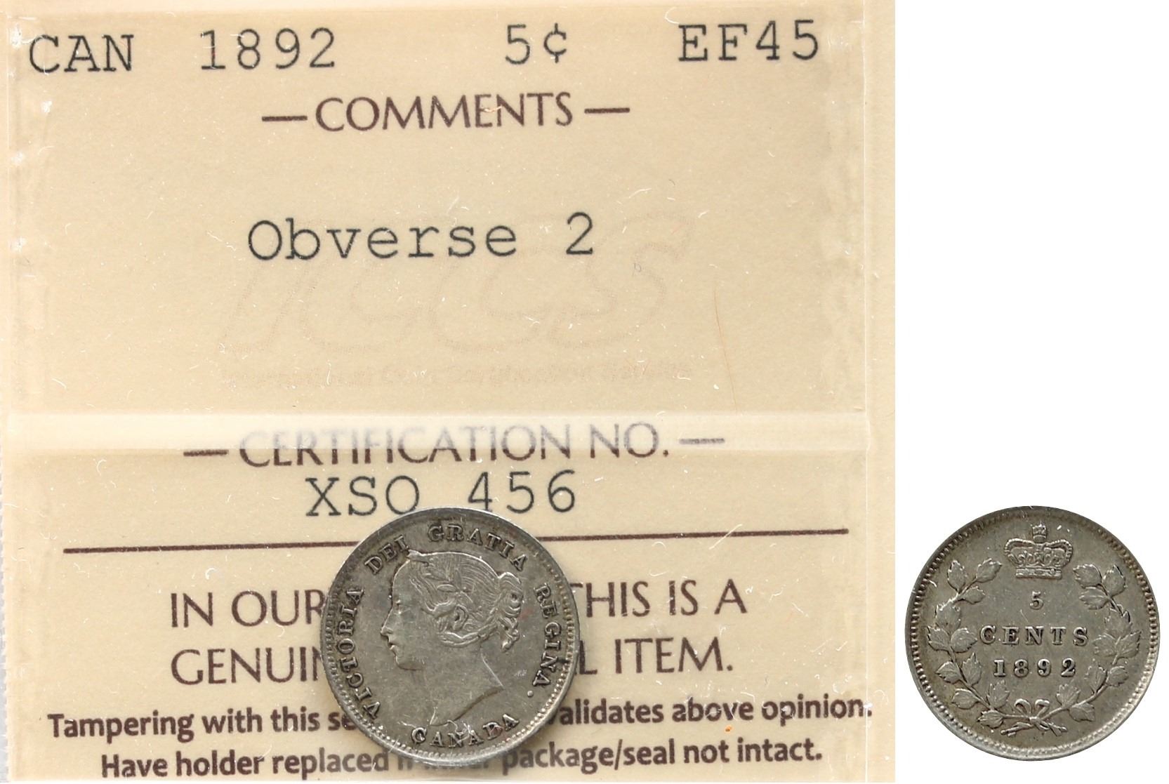 1892 5¢ "Obv 2" ICCS Choice Extra Fine-45