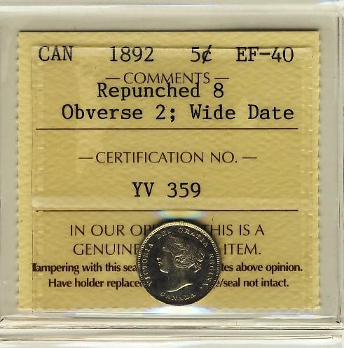 1892 5¢ Obv 2 Wide Date Repunched 8 ICCS EF40.