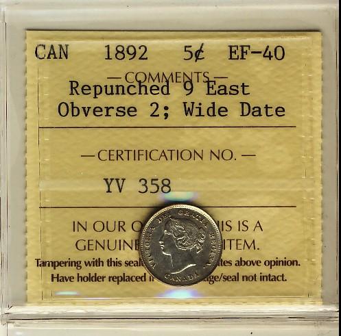 1892 5¢ Obv 2 Wide Date Repunched 9 East ICCS EF40.