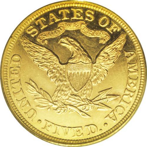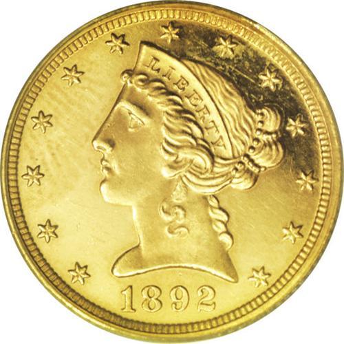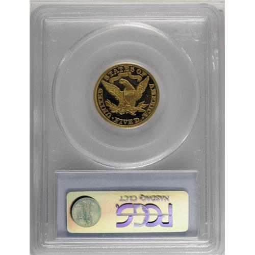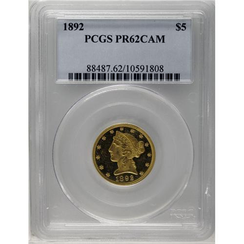 <B>1892<$5> PR62 Cameo PCGS.</B></I> A rare coin from a recorded proof mintage of 92 examples, of which the just-issued Garrett-Guth gold <I>Encyclopedia</B></I> estimates that only 20 to 30 pieces are known today, including those in "museums and tightly held collections." The present example shows deeply mirrored fields and frosty devices, as expected, with sunrise-gold surfaces. A few tiny surface impairments are faintly visible, along with what appears to be a faint fingerprint smudge on the left obverse. Better than it sounds, and worthy of a close look and some spirited bidding. Proof gold, like Beluga caviar, is getting scarcer and scarcer. Population: 1 in 62 Cameo, 2 finer (6/06).
