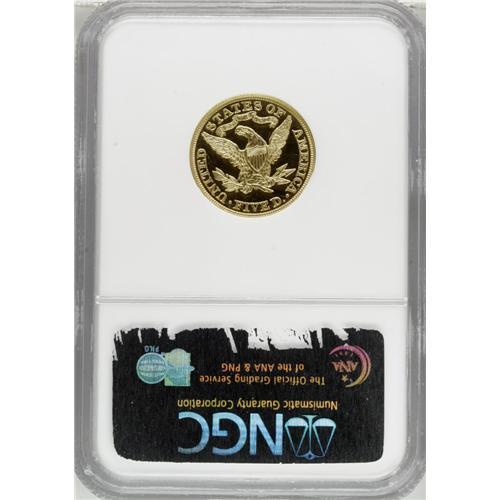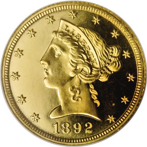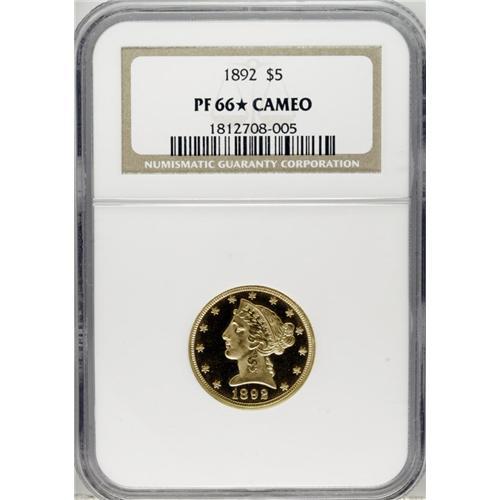 <B>1892 $5 PR66 <img border='0' src='http://www.heritagecoins.com/images/star.gif' width=10 height=10> Cameo NGC.</B></I> The mintage of proof 1892 half eagles was limited to 92 coins, and few have survived over the years. In fact, this date is quite elusive with the total population estimated to be about 20 or 25 coins. Jeff Garrett and Ron Guth had this to say: "Despite a higher mintage than the 1891 issue, the 1892 half eagle is just as rare in proof. There are just 20 to 30 coins known, including those in museums and tightly held collections. Proof gold coins of this era can never be reliably located for purchase. It can sometimes be several years before an example is offered for sale. The higher denomination gold coins also become much more difficult to find in Choice condition. Many entered circulated or were mishandled."<BR> Our notes on proof gold coins indicate that this piece is among the finest known. The Smithsonian Institution has two different examples, both graded PR64 Deep Cameo. The Walter H. Childs Collection specimen, purchased directly from the Mint and sold in 1999, is considered the finest known piece and it carries a grade similar to this specimen. The Eliasberg and Trompeter collections each contained Gem quality proofs, while Harry Bass had a coin that was graded PR63 in 1999. The Garrett, Pittman, and Carter collections each had Choice Proof examples.<BR> This is a remarkable Cameo proof, possibly one of the finest known, with deeply mirrored yellow-gold surfaces. The devices on both sides exhibit brilliant yellow-gold luster in full contrast to the reflective fields. The surfaces are pristine, with no blemishes to serve as pedigree markers. NGC has certified exactly one finer coin, a PR67 Ultra Cameo piece.<BR><BR><b>Shipping:</b> Coins & Currency (<a target="_blank" href="http://www.heritageauctions.com/common/shipping.php">view shipping information</a>)