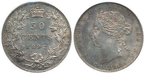 1892 50¢ ICCS MS63, well struck with full lustre on both sides. Lightly toned. Very rare in choice mintstae condition.