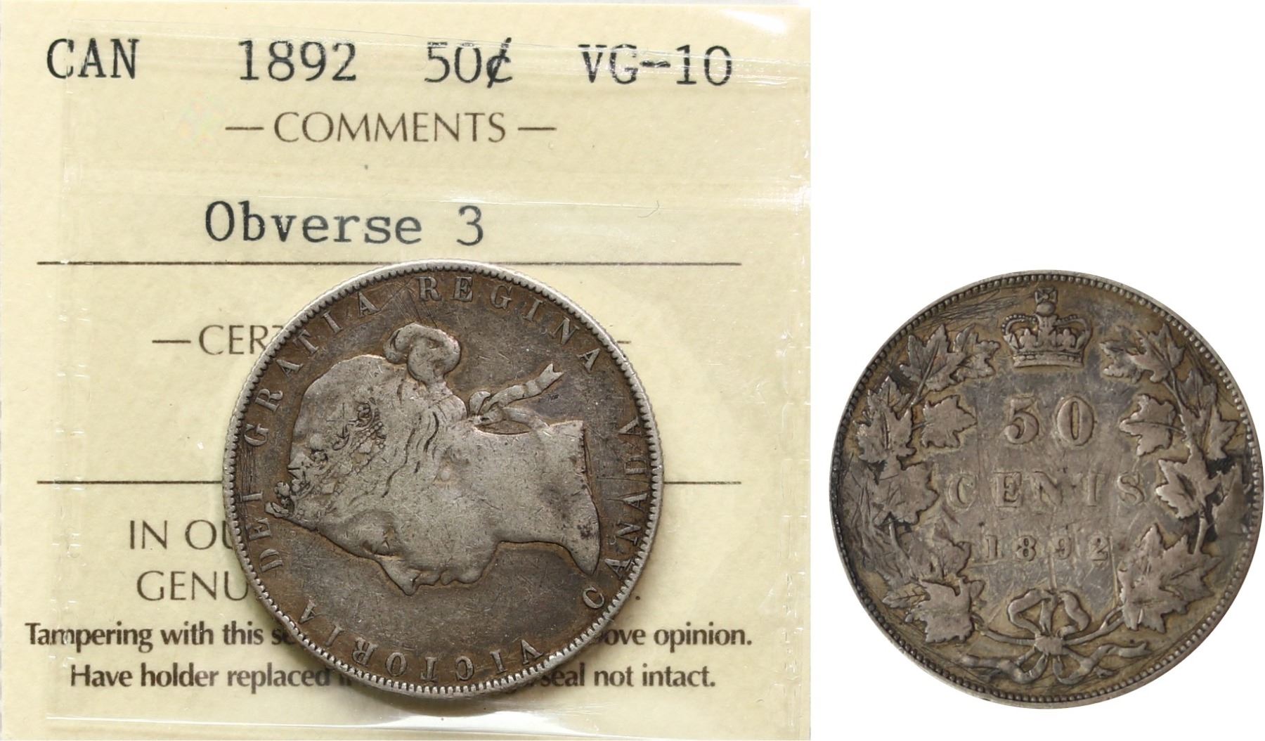 1892 50¢ "Obv.3" ICCS Very Good-10, Very scarce obverse type.