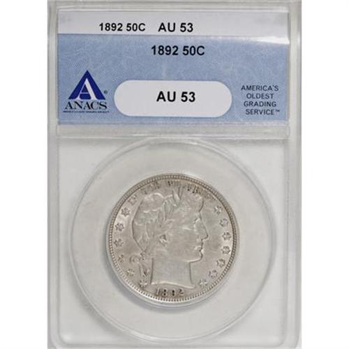 <B>1892 50C AU53 ANACS.</B></I> NGC Census: (10/685). PCGS Population (25/903). Mintage: 934,000. Numismedia Wsl. Price for NGC/PCGS coin in AU53: $233. (#6461)<BR><BR><B>Coin Engraver:</B> Charles E. Barber<BR><BR><b>Shipping:</b> Coins & Currency (<a target="_blank" href="http://www.heritageauctions.com/common/shipping.php">view shipping information</a>)
