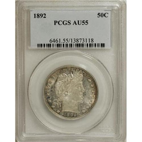 <B>1892 50C AU55 PCGS.</B></I> PCGS Population (80/802). NGC Census: (26/658). Mintage: 934,000. Numismedia Wsl. Price for NGC/PCGS coin in AU55: $250. (#6461)<BR><BR><B>Coin Engraver:</B> Charles E. Barber<BR><BR><b>Shipping:</b> Coins & Currency (<a target="_blank" href="http://www.heritageauctions.com/common/shipping.php">view shipping information</a>\)