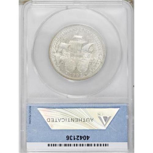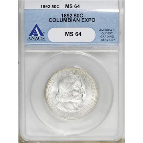 <B>1892 50C Columbian MS64 ANACS.</B></I> NGC Census: (1766/1085). PCGS Population (1498/786). Mintage: 950,000. Numismedia Wsl. Price for NGC/PCGS coin in MS64: $156. (#9296)<BR><BR><b>Shipping:</b> Coins & Currency (<a target="_blank" href="http://www.heritageauctions.com/common/shipping.php">view shipping information</a>)