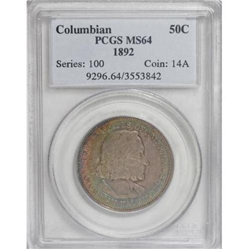 <B>1892 50C Columbian MS64 PCGS.</B></I> PCGS Population (1465/762). NGC Census: (1742/1057). Mintage: 950,000. Numismedia Wsl. Price for NGC/PCGS coin in MS64: $156. (#9296)<BR><BR><b>Shipping:</b> Coins & Currency (<a target="_blank" href="http://www.heritageauctions.com/common/shipping.php">view shipping information</a>\)
