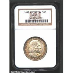 1892 50C Columbian MS65 NGC. Superior eye appeal with a stunning blend of white mint bloom and attractive shades of gold, blue, and steel-gray. The strike is above average, but not full, and the surfaces exhibit few noticeable marks.From the Ric Leichtung Collection. Important notice: We expect to be auctioning lots at the rate of 200-250 per hour. Sometimes eBay Premier live bid software cannot keep up with that pace, so we strongly recommend that you place a realistic proxy bid now as insurance to avoid disappointment. Also please note that all Heritage/CAA lots purchased through eBay Premier carry a 20% Buyer's Premium.