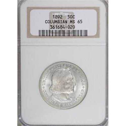 <B>1892 50C Columbian MS65 NGC.</B></I> NGC Census: (833/252). PCGS Population (618/168). Mintage: 950,000. Numismedia Wsl. Price for NGC/PCGS coin in MS65: $600. (#9296)<BR><BR><b>Shipping:</b> Coins & Currency (<a target="_blank" href="http://www.heritageauctions.com/common/shipping.php">view shipping information</a>)