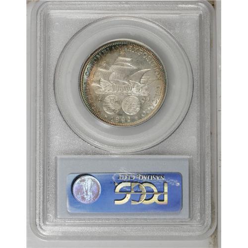 <B>1892<50C> Columbian MS65 PCGS.</B></I> A highly lustrous Gem example with a typical strike. The left obverse periphery has golden-brown toning, while arcs of turquoise and orange appear near the left reverse rim.