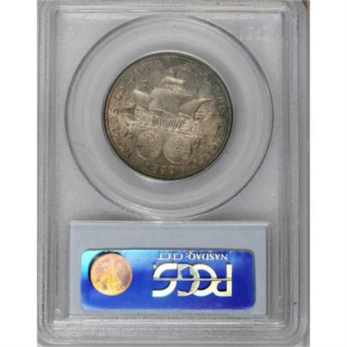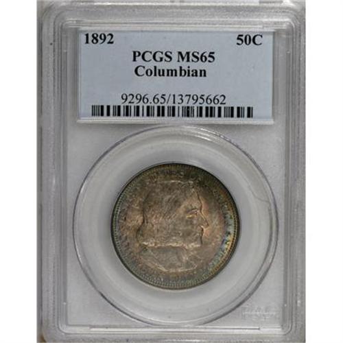 <B>1892 50C Columbian MS65 PCGS.</B></I> FS-301. The peak of the 2 is repunched. The nicest of the three repunched date varieties listed in the fourth edition, Volume 2 of the <I>Cherrypickers' Guide.</B></I> Rich golden-brown, powder-blue, and plum-red toning adorns this satiny and suitably struck Gem.<BR><BR><b>Shipping:</b> Coins & Currency (<a target="_blank" href="http://www.heritageauctions.com/common/shipping.php">view shipping information</a>)