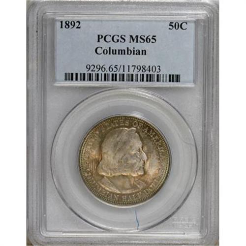 <B>1892 50C Columbian MS65 PCGS.</B></I> PCGS Population (598/167). NGC Census: (821/245). Mintage: 950,000. Numismedia Wsl. Price for NGC/PCGS coin in MS65: $600. (#9296)<BR><BR><b>Shipping:</b> Coins & Currency (<a target="_blank" href="http://www.heritageauctions.com/common/shipping.php">view shipping information</a>)
