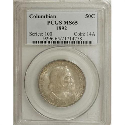 <B>1892 50C Columbian MS65 PCGS.</B></I> PCGS Population (598/167). NGC Census: (821/245). Mintage: 950,000. Numismedia Wsl. Price for NGC/PCGS coin in MS65: $600. (#9296)<BR><BR><b>Shipping:</b> Coins & Currency (<a target="_blank" href="http://www.heritageauctions.com/common/shipping.php">view shipping information</a>)