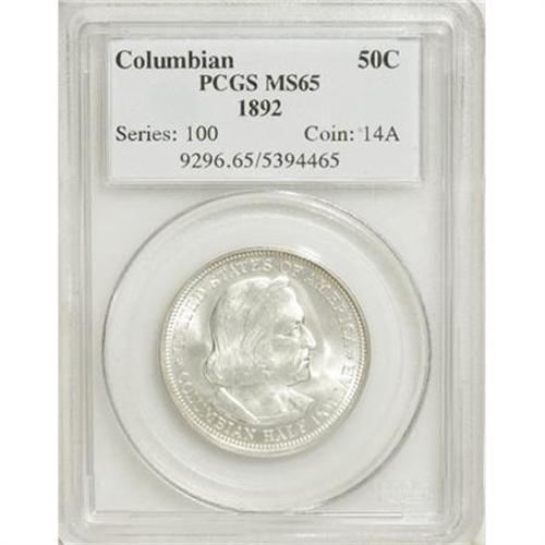 <B>1892 50C Columbian MS65 PCGS.</B></I> PCGS Population (615/171). NGC Census: (832/250). Mintage: 950,000. Numismedia Wsl. Price for NGC/PCGS coin in MS65: $600. (#9296)<BR><BR><b>Shipping:</b> Coins & Currency (<a target="_blank" href="http://www.heritageauctions.com/common/shipping.php">view shipping information</a>)