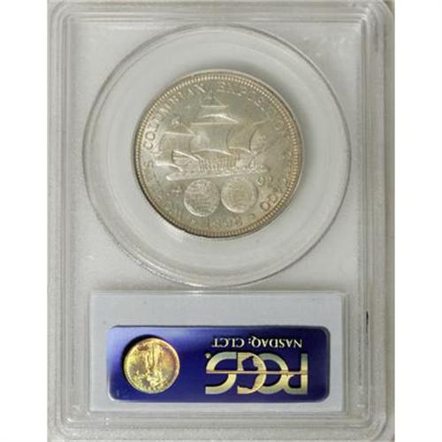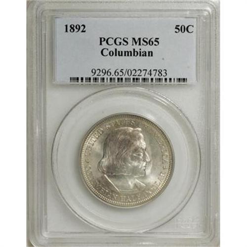 <B>1892 50C Columbian MS65 PCGS.</B></I> . PCGS Population (621/169). NGC Census: (836/255). Mintage: 950,000. Numismedia Wsl. Price for NGC/PCGS coin in MS65: $480. (#9296)<BR><BR><b>Shipping:</b> Coins & Currency (<a target="_blank" href="http://www.heritageauctions.com/common/shipping.php">view shipping information</a>)