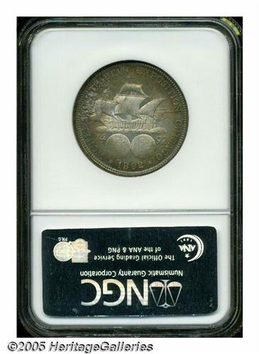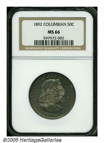 <B>1892<50C> Columbian MS66 NGC.</B></I> Warm multicolored patina bathes lustrous surfaces that are remarkably clean. The design elements are well struck up. Population: 166 in 66, 24 finer (5/05).