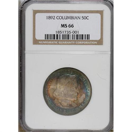 <B>1892 50C Columbian MS66 NGC.</B></I> Concentrically toned with lavender and reddish-orange in the center and blue-green at the periphery. Solidly struck with pleasing luster and clean surfaces. A delightful representative of the nation's first silver commemorative.<BR><BR><b>Shipping:</b> Coins & Currency (<a target="_blank" href="http://www.heritageauctions.com/common/shipping.php">view shipping information</a>)