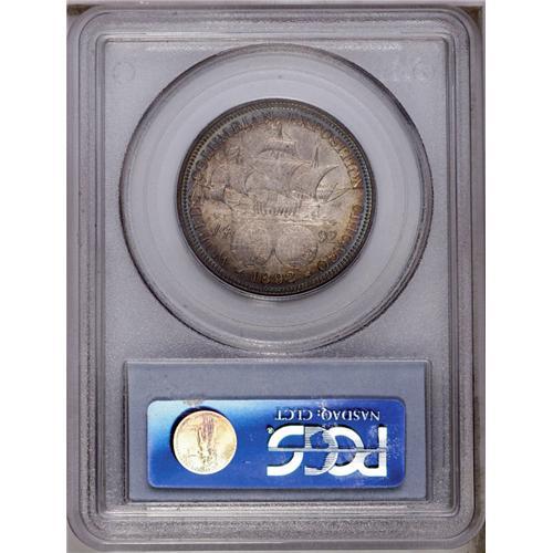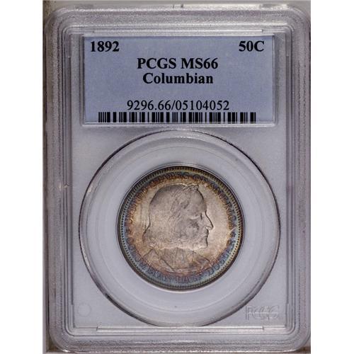 <B>1892<50C> Columbian MS66 PCGS.</B></I> Electric-blue and golden-brown patination borders lightly toned centers. A crisply struck, lustrous, and impressive representative of the first U.S. commemorative. Essentially perfect aside from a couple of ticks on the sails.