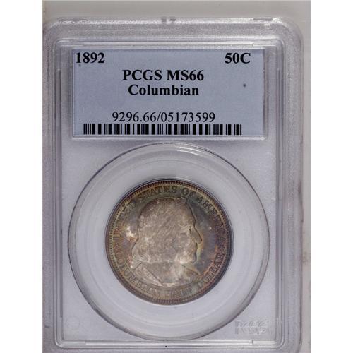 <B>1892<50C> Columbian MS66 PCGS.</B></I> Reddish-gold patina appears on both sides, joined by plum on the obverse. Sharply struck for this issue with great luster. PCGS has certified just nine finer examples (8/06).