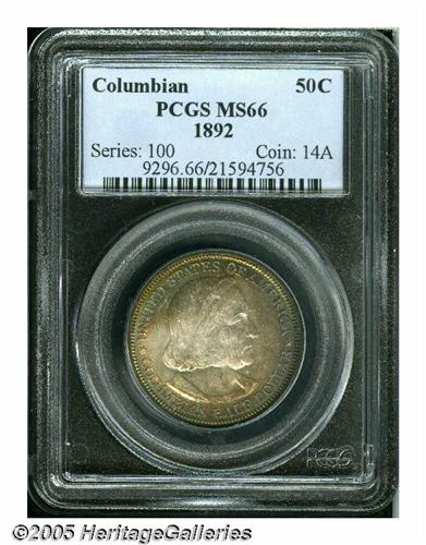 <B>1892<50C> Columbian MS66 PCGS.</B></I> Stunning iridescent blues, greens, golds, and reds cover both sides of this blatantly original 'first' commem. With the current demand for toned Gems, watch this coin soar.