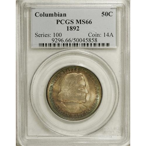 <B>1892 50C Columbian MS66 PCGS.</B></I> This example of America's first commemorative half has stellar eye appeal. Vibrant luster shines beneath outer rings of ocean-blue, peach-rose, and gold that fade to silver-gray at the center of the obverse and brilliance at the same place on the reverse. The <I>Population Report</B></I> lists just nine coins in higher grades (3/07).<BR><I>From The Cary & Cheryl Porter Collection.</B></I><BR><BR><b>Shipping:</b> Coins & Currency (<a target="_blank" href="http://www.heritageauctions.com/common/shipping.php">view shipping information</a>)