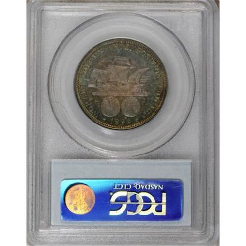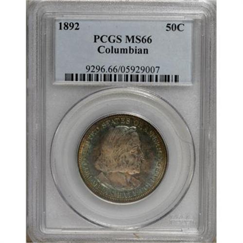 <B>1892 50C Columbian MS66 PCGS.</B></I> Although not designated as such by PCGS, this piece has fully prooflike surfaces beneath radiant multi-colored toning. Just nine finer examples have been certified by PCGS (6/07).<BR><BR><b>Shipping:</b> Coins & Currency (<a target="_blank" href="http://www.heritageauctions.com/common/shipping.php">view shipping information</a>)