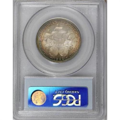 <B>1892 50C Columbian MS66 PCGS.</B></I> Cobalt-blue and lavender patination hugs the peripheries of this highly lustrous Columbian, the nation's first silver commemorative. Decisively impressed motifs enhance the coin's eye appeal, and the surfaces are impeccably preserved. PCGS has certified just nine coins finer (8/07).<BR><BR><b>Shipping:</b> Coins & Currency (<a target="_blank" href="http://www.heritageauctions.com/common/shipping.php">view shipping information</a>)