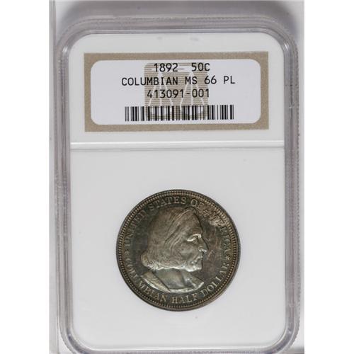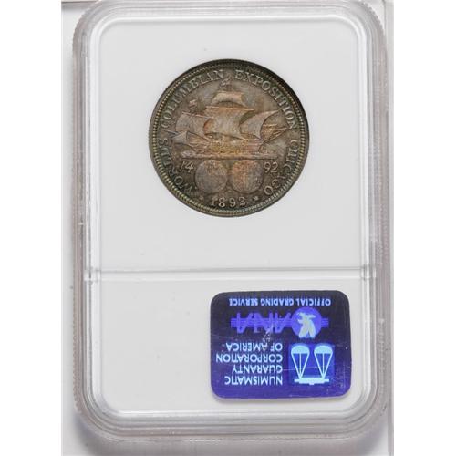 <B>1892<50C> Columbian MS66 Prooflike NGC.</B></I> A moderately reflective example and nicely struck, though the details are weaker than those seen on true proofs. Vivid gold, blue, and red patina enriches each side.