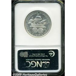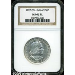 <B>1892 50C Columbian MS66 Prooflike NGC.</B></I> The brilliant-white surfaces combine frosty textured devices and glassy fields for a modest, yet pleasing cameo finish that is somewhat more evident on the reverse. The strike is appreciably sharp for a business strike Commemorative of this type, and the solidly graded surfaces are free of all but one or two inconsequential abrasions. Worthy of a premium quality bid.